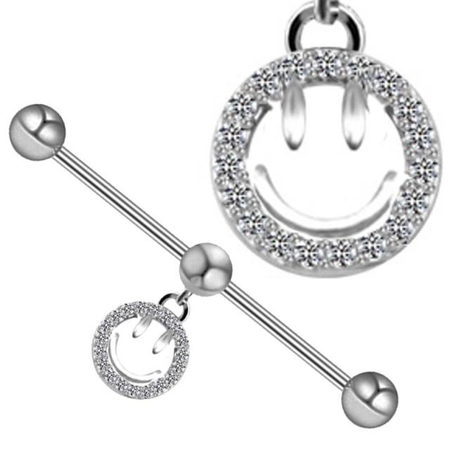 長いインダストリアル用の16ゲージのストレートバーベルにクリスタルのキュービックジルコニアをセットしたスマイルくんのチャームが揺れるボディピアス。ストレートバーベルにセットしたスマイル君のボールチャームは中にシリコンゴムがセットされているのでバーベルの好きな位置でチャームが固定できる人気のスマイルクンボディーピアス。
