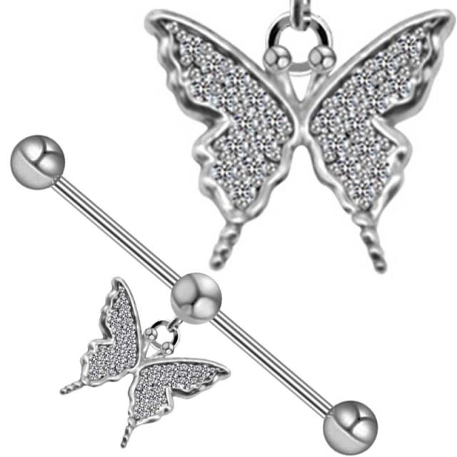 [16G ボディピアス] ムーブボールチャームインダストリアル(バタフライ) ボディーピアス 16ゲージ 16g ステンレス 長い ロングバーベル メガバーベル メンズ レディース プレゼント 男性 女性 耳 クリスタル ジュエル 蝶 チョウ ちょう キラキラ パベ パヴェ 石付 ストーン