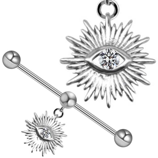 [16G ボディピアス] ムーブボールチャームインダストリアル(サンアイズ) ボディーピアス 16ゲージ 16g ステンレス 長い ロングバーベル メガバーベル メンズ レディース プレゼント 男性 女性 耳 クリスタル ジュエル 太陽 眼 目 不気味 ストーン ジュエル 揺れる 動く