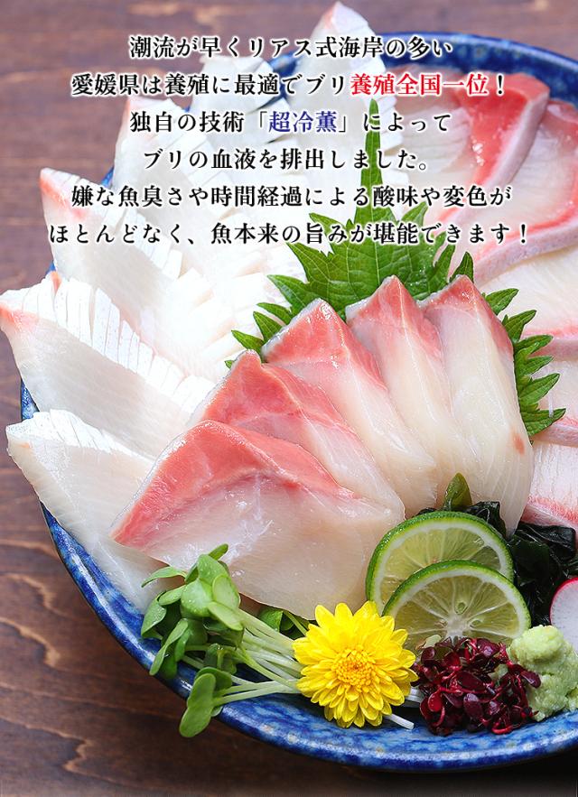独自の技術「超冷薫」によって、ブリの血液を排出!嫌な魚臭さや時間経過による酸味や変色がほとんど無く、魚本来の旨みが堪能できます!愛媛県は潮流が早く、リアス式海岸の多い養殖に最適な県で、ブリ養殖全国一位!脂乗りバツグン!上品な脂がお口の中で広がり、とろけるような口当たりです。皮や骨は取り除いてありますので、お好みの厚さで切り分けるだけで豪華なお刺身が完成します♪