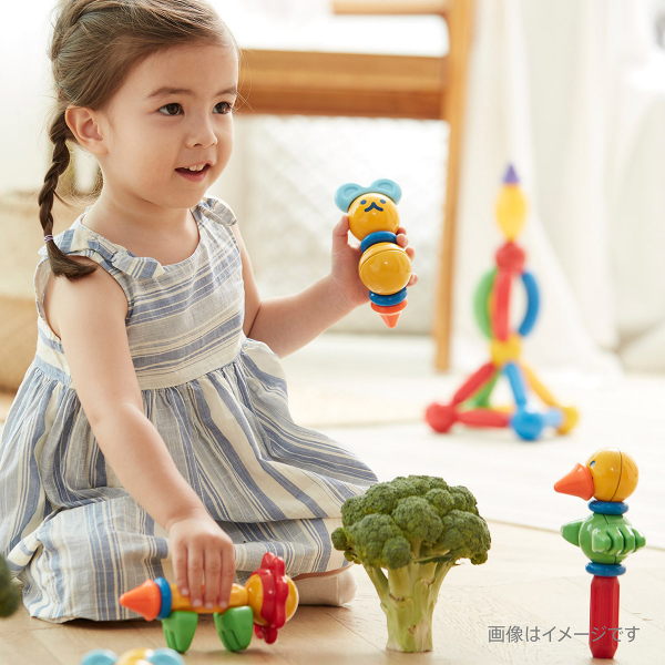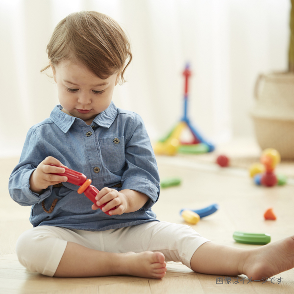 はめ込むブロックと違い、つなげる位置が多少ずれてもブロック同士が引きつけ合うので、目と手の協応が発達途上でも遊びやすくなっています。