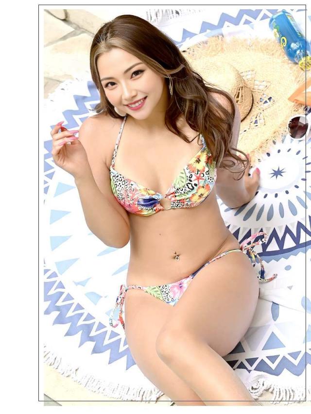 ☆バスト盛りしやすいホルターネックビキニブラの中心についたゴールドリングからの肌魅せがエロさをプラスしてくれるカラフルなバンドゥ風水着は海やプールで注目されること間違い無しの紐ビキニです♪