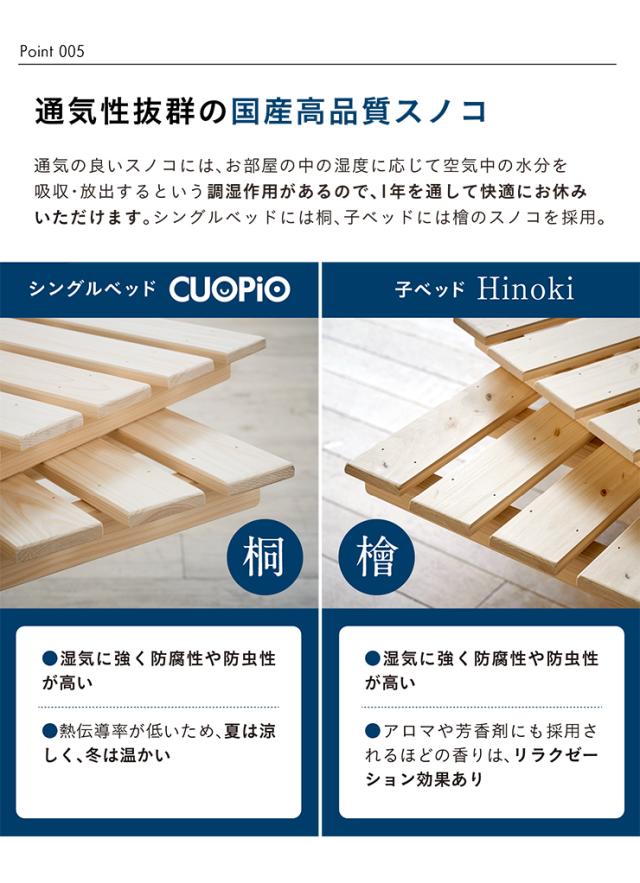 すのこ:桐材(シングルベッド クオピオ)、九州産檜(子ベッドひのき)