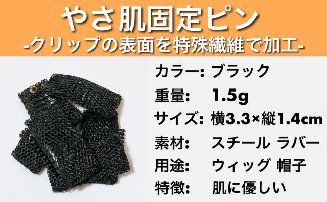 【はだ想い】 特徴:【やさ肌クリップ】は金属クリップの表面を特殊繊維で覆っています。その結果、クリップの付け外しによる痛みが軽減致します。また髪や頭皮に触れる面積が増大するため、優しい付け心地になっています。フルウィッグ・部分ウィッグ・エクステ・ウィッグネット等、やさ肌クリップを簡単に取り付けることが出来ます。