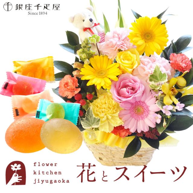 花とスイーツのセット ピック付き 季節のフラワーギフト「ミックス」+【銀座千疋屋】ひとくちフルーツゼリーセット 送料無料 プレゼント 誕生日 記念日 お祝い花 即日発送 あすつく メッセージカード FKAASW