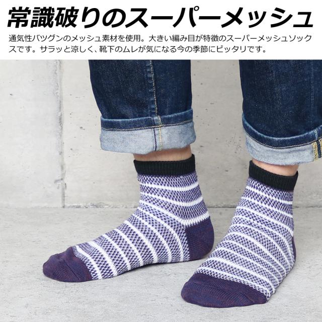 ●常識破りのスーパーメッシュ。通気性バツグンのメッシュ素材を使用。 大きい編み目が特徴です。 ●足のニオイの原因である細菌の増殖を抑える抗菌防臭加工のソックスです。 ●丈の長さは、くるぶしより少し長く、足首部分が隠れる長さのミドル丈(ハーフ丈)です。どんなスタイルにも合わせやすくてオールシーズン大活躍です!! |