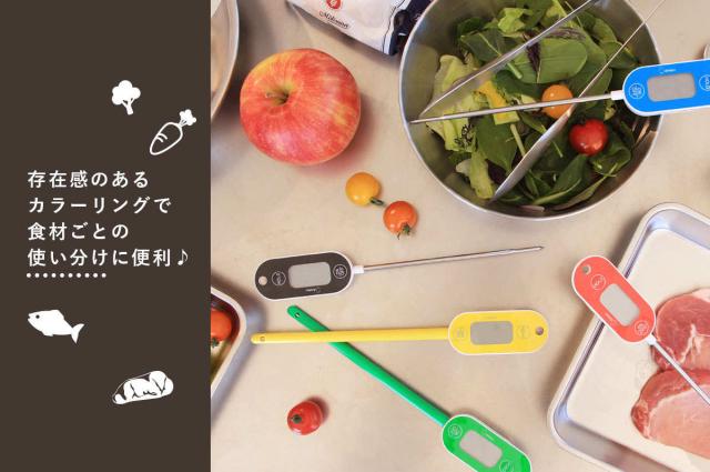 存在感のあるビビットなカラーバリエーションの防水デジタル温度計です。色違いを揃えれば食材ごとの調理に使い分けられて、お料理がはかどります。