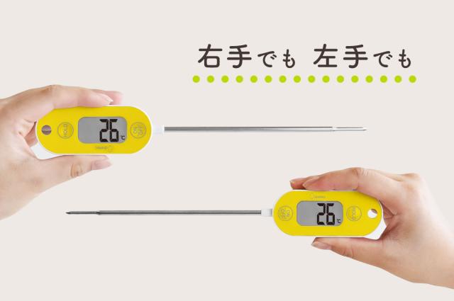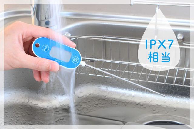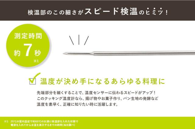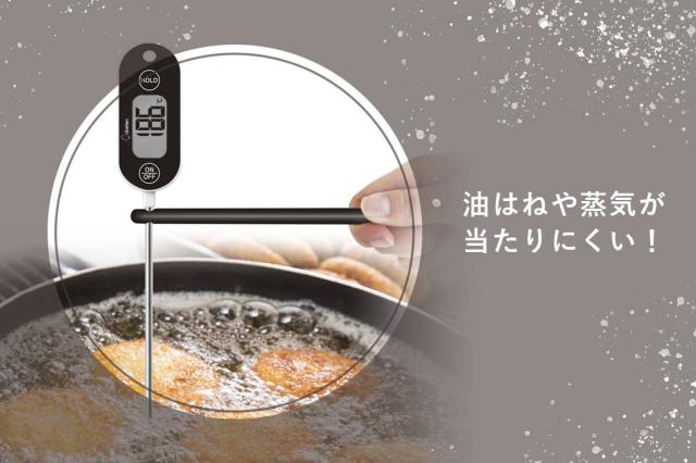 電源を入れてから水温を表示するまで約7秒で測定できます。先端部分を細くすることで、温度センサーに伝わるスピードがアップしました。揚げ物やお菓子作り、パン生地の発行など、繊細な温度を素早く計りたい時に活躍します。