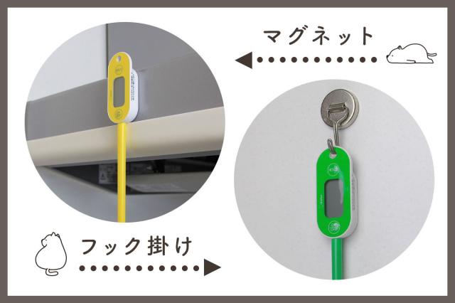 マグネットが裏面に付いているので、冷蔵庫などにしっかりと貼り付けることができます。また、穴にフックを通して壁掛け収納もできます。