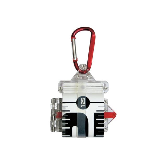 メジャーはシリコンバンドで、コンパクトに収納でき、バッグやベルトループにも装着できるカラビナ付き。