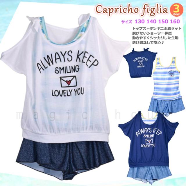 ◆ Capricho figlia キッズ ジュニア ガールズ タンキニ 水着 Tシャツ 3点 セット ボーダー柄 スイムウェア◆