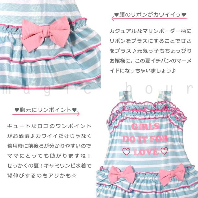 水着 キッズ 子供 女の子 ボーダー フリル ワンピース ガールズ スイムウェア 女子 かわいい リボン 女児 100cm 110cm 120cm 130cm お洒落 オールインワン