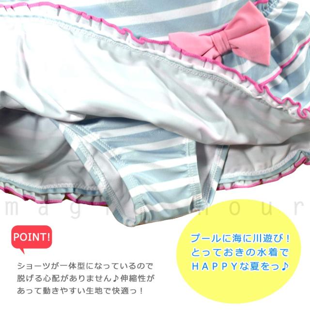 サイズ: 100, 110, 120, 130/ 身長に合わせてお選びください。 ワンポイントのリボンと裾のフリルがちょっぴりお嬢様なボーダー柄のガールズ水着♪ トップスとショーツが一体型のワンピースタイプ。 動きやすくシッカリした生地で透け感なしで安心☆ |