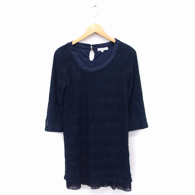 【中古】グローブ grove レース ワンピース 七分袖 ひざ丈 丸首 シフォン サテン M ネイビー 紺 /FT31 レディース