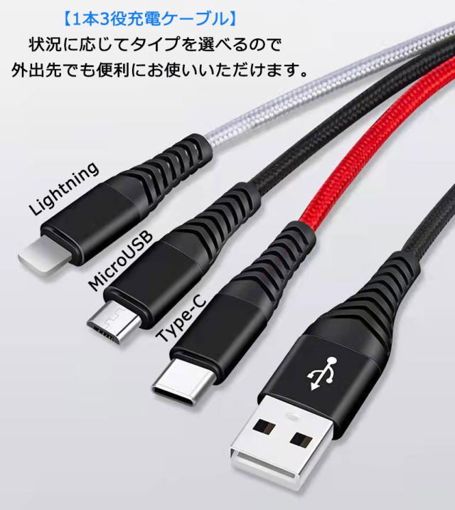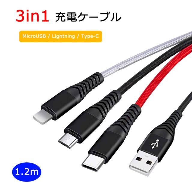 3in1 充電ケーブル 3A 3カラー 急速充電 1.2m iPhone / Android / USB Type C 3in1 USB コード 1本3役 ライトニング / MicroUSB / USB-C 充電ケーブル 高耐久 ナイロン Lightning / タイプC Cable 120cm