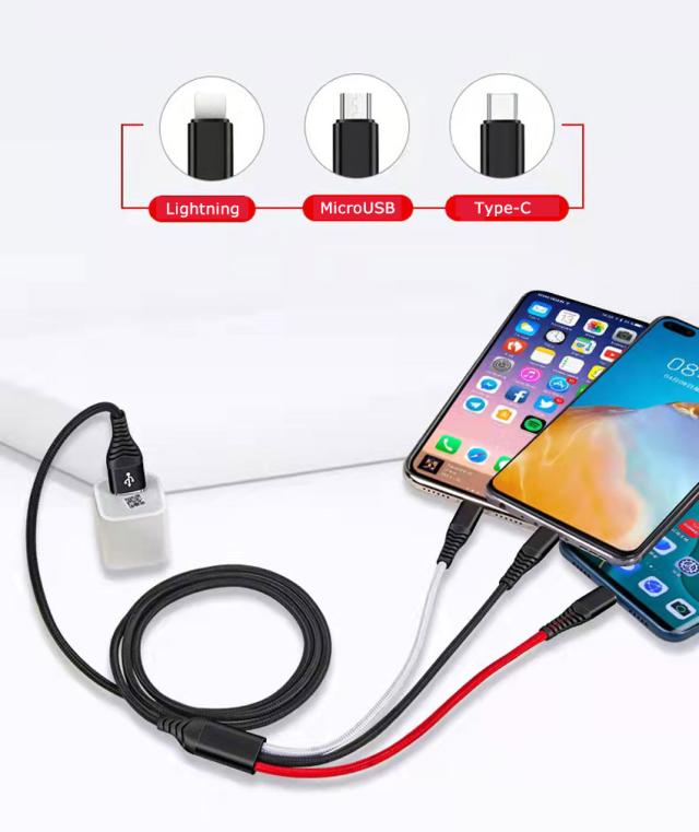 MicroUSB / Lightning / Type-C の3in1充電ケーブルです。iPhone 、Android 設備に同時充電可能です。