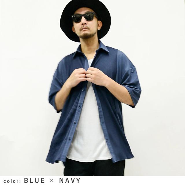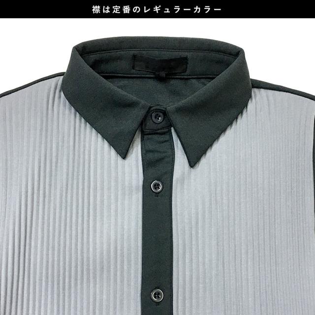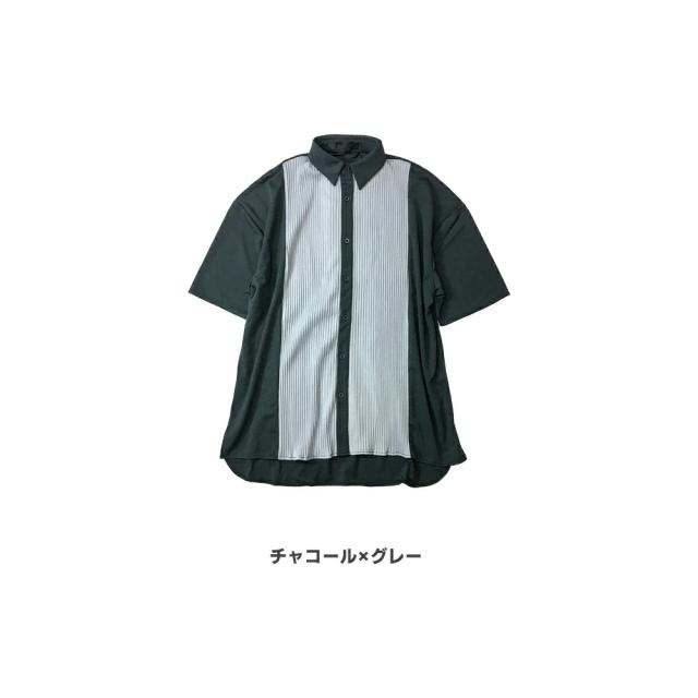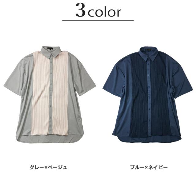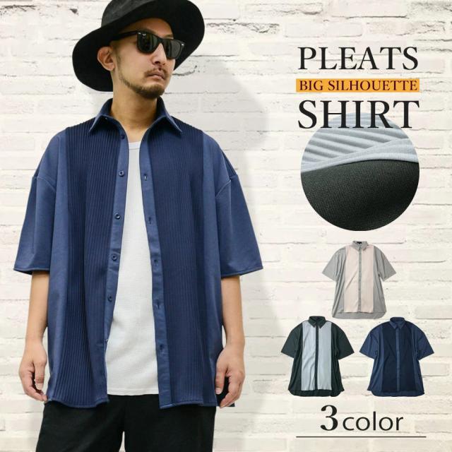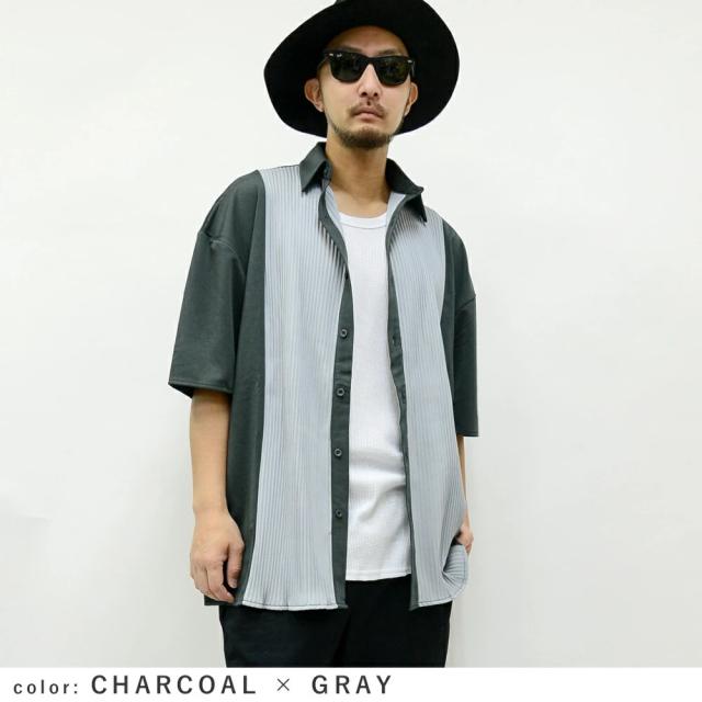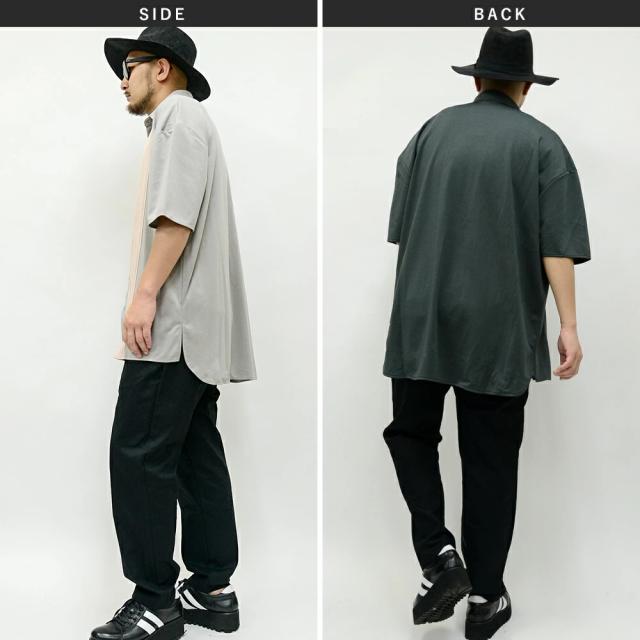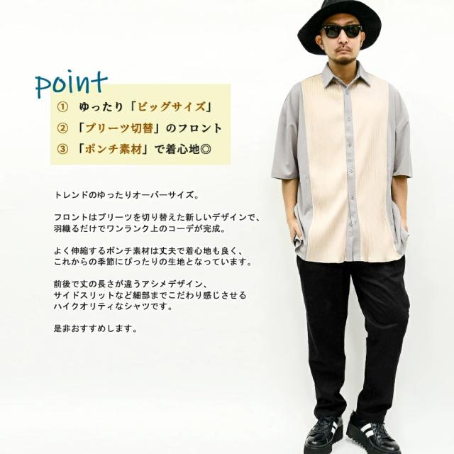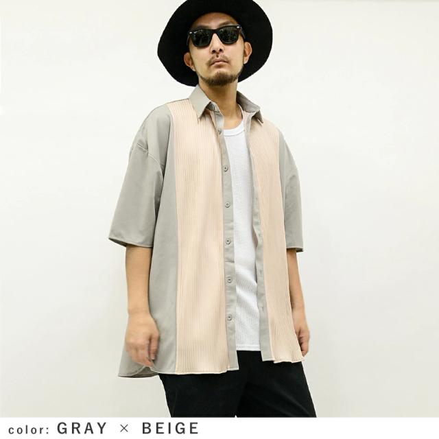 【閉店セール】プリーツ切替オーバーサイズ 半袖シャツ 1038vrメンズシャツ 半袖シャツ ビッグシルエット オーバーサイズ ポンチ素材 ジャージ プリーツ切替 スリット とろみ素材 前後アシメ丈 背面ラウンドカット 無地 グレーベージュ M L シャツ