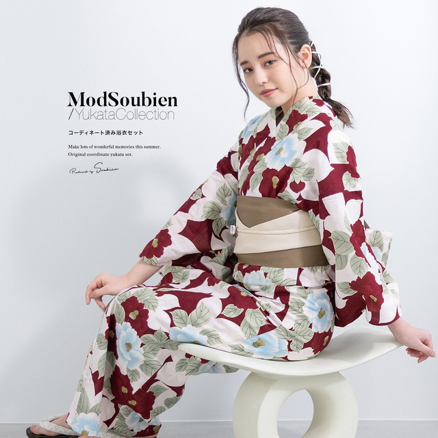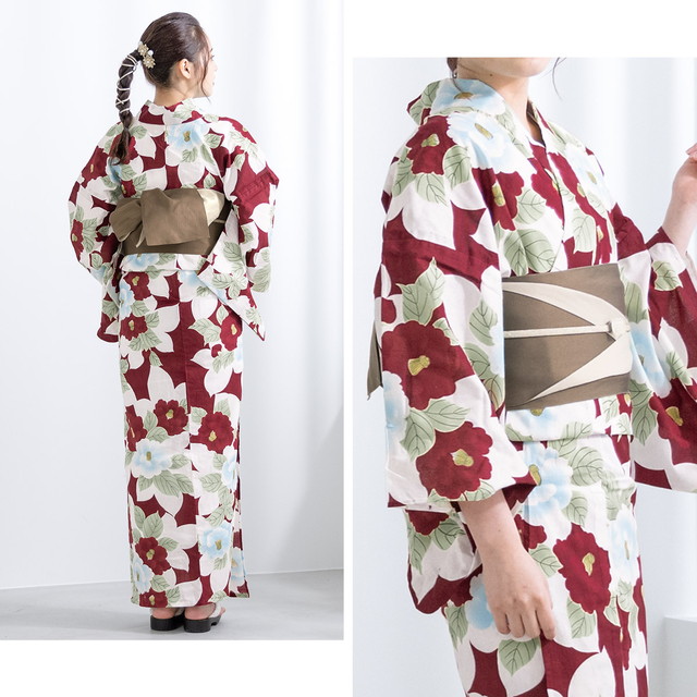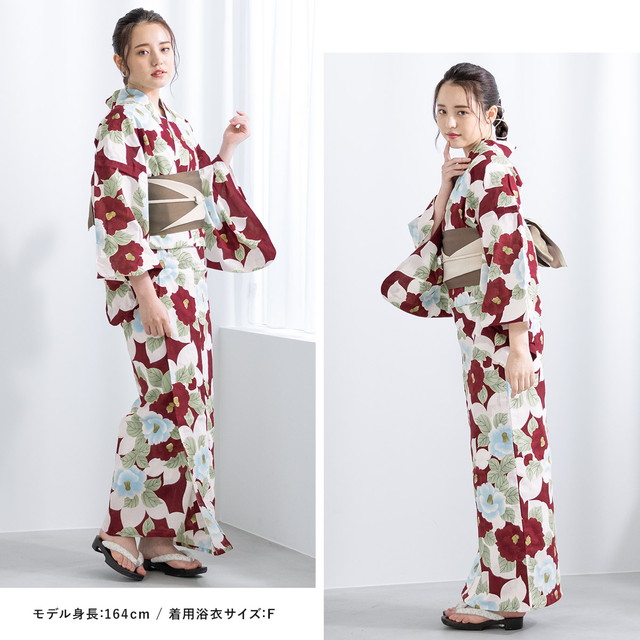 浴衣セット レディース 浴衣セット 半幅帯 大人 3点セット ボヌールセゾン 赤 レッド 白 グレージュ 椿 綿麻 夏 花火大会 モダン Sサイズ フリーサイズ