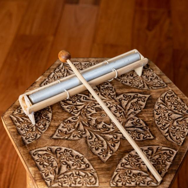 撥で叩くとキーンと言う素敵な音が長く続くエナジーチャイム。その音の純粋さ、奇麗さに惚れてしまいます。とても澄んだきれいな音色がするので、ヒーリング用などに使われています。チャイム本体部分は、アルミニウムで作られていて良い音色がします。
