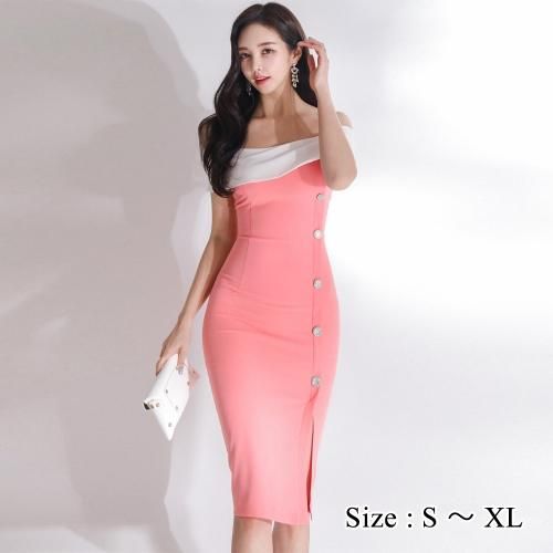 【グラシア】 キャバ ドレス キャバドレス ワンピース ミディアムドレス オフショル ガーリー 飾りボタン ピンク×ホワイト S M L XL