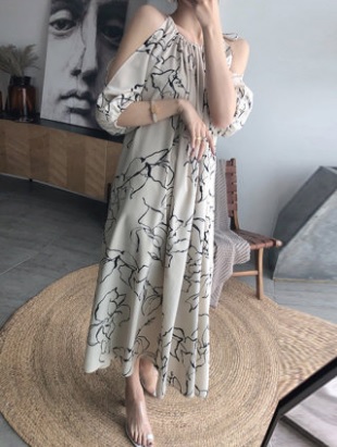 ロングワンピース 細見え 夏 普段使い お呼ばれ お出かけ デート 白 シフォン 大きめ 大人 清楚 可愛い 上品 フェミニン ゆったり Aライン 五分袖 肩だし マキシ丈 人気 トレンド 10代 20代 30代
