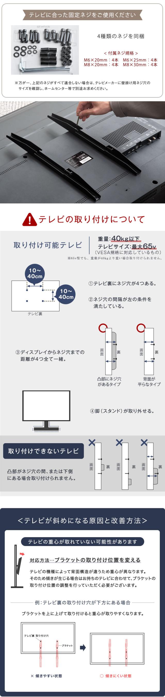 - 他にもコメントしてありますが突っ張りだけだと少し不安が… ネジ穴が悪いのかネジが入りにくくしめにくい場所があります。 それ以外は問題無くテレビも無事に設置出来ました。 テレビ周りがスッキリしたので良か...