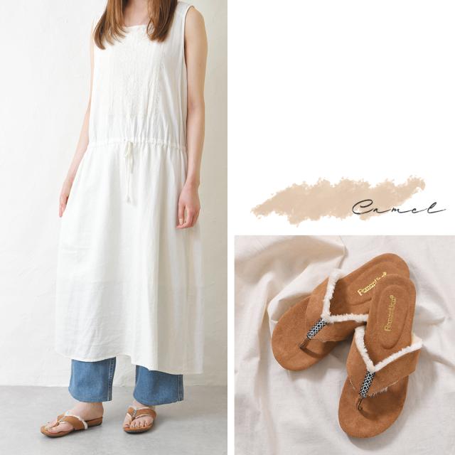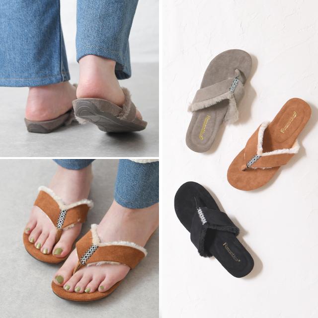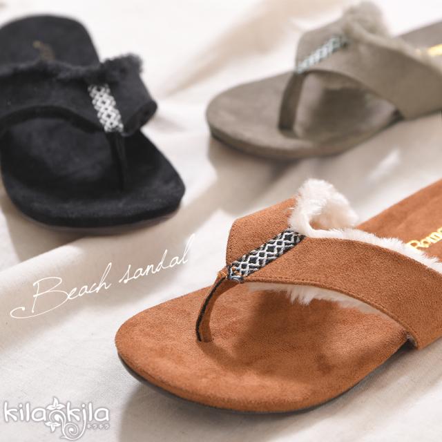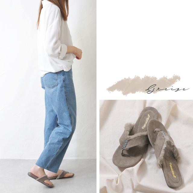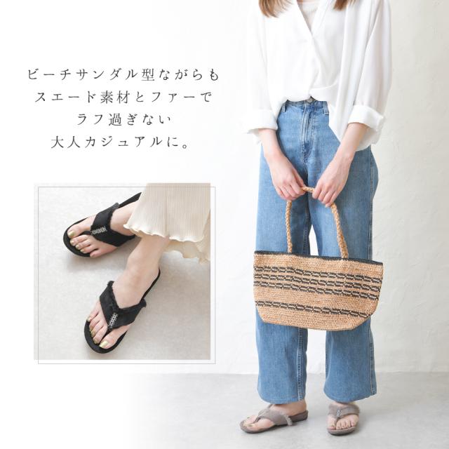 ビーチサンダル型ながらもスエード素材とファーでラフ過ぎない大人カジュアルに。
