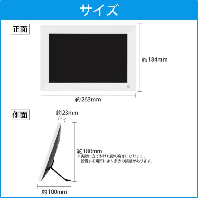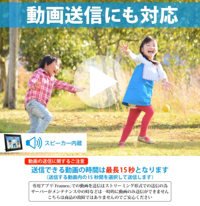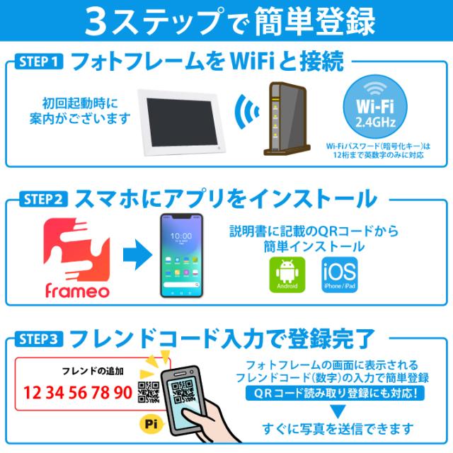 | 注意 | ・アプリから写真を送信する場合、本製品が2.4GHzのWiFiに接続されている必要があります。 ・専用アプリ「Frameo」からフォトフレームに動画を送信する際は、ストリーミング再生形式での送信となり、メーカーのサーバーがメンテナンス中などの場合、動画のみ送信できません。 こちらは商品の故障ではありませんのでご安心ください。 |