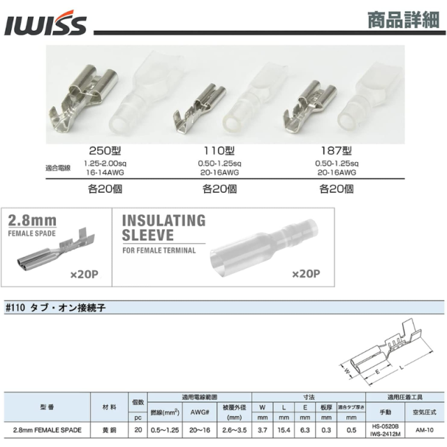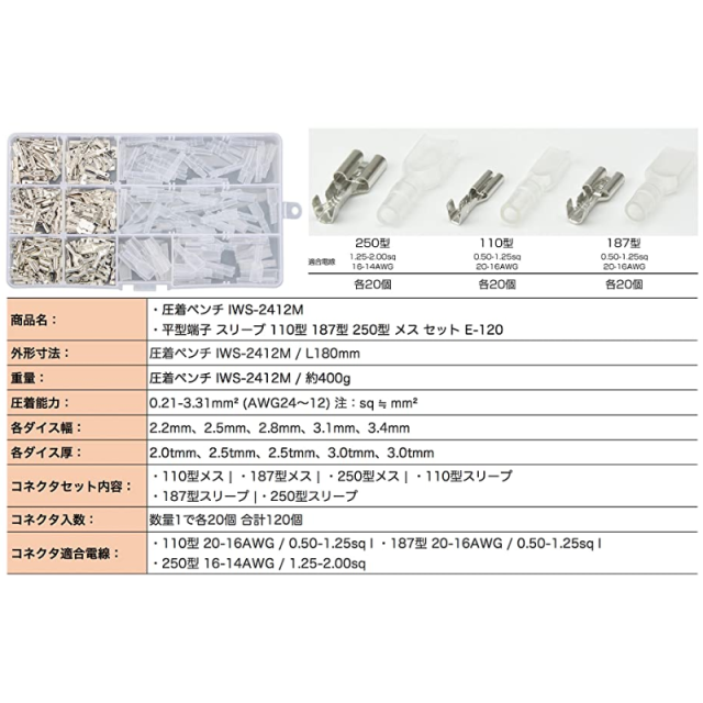 平型端子 スリーブ 110型 187型 250型と精密圧着ペンチIWS-2412Mのセット商品です。