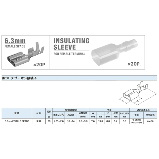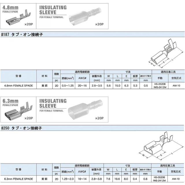 適合電線:・110型 20-16AWG / 0.50-1.25sq I ・187型 20-16AWG / 0.50-1.25sq I ・250型 16-14AWG / 1.25-2.00sq