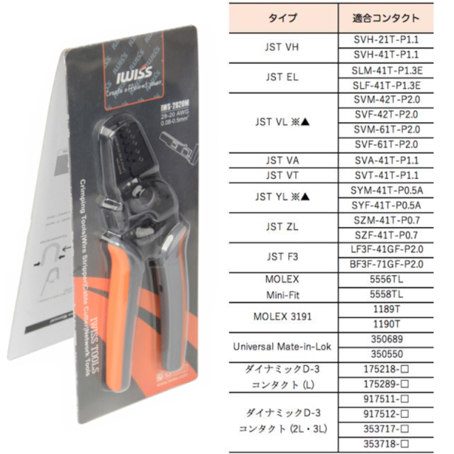 付属品:187型 20-16AWG / 0.50-1.25sq, 圧着ペンチ(0.21-3.31mm(sq) 小・中型端子用)、110型 20-16AWG / 0.50-1.25sq、250型 16-14AWG / 1.25-2.00sq