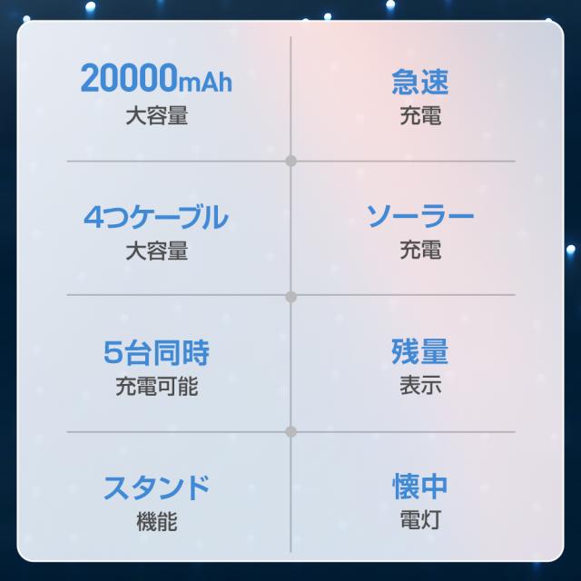 20000mAh超大容量を備え、スマホとタブレットはもちろん、カメラ、ゲーム機にも充電できるモバイルバッテリーです。ほとんどのUSB機器に複数回充電可能、旅行、出張など電源の取りにくい環境でバッテリー切れの心配がありません。最大2Aの出力電流でフルスピード充電が可能、通常より充電スピードを大きく上げて、充電時間を短くできます。日頃の使用だけではなく、台風・地震など災害時の非常用電源としても大活躍しています。