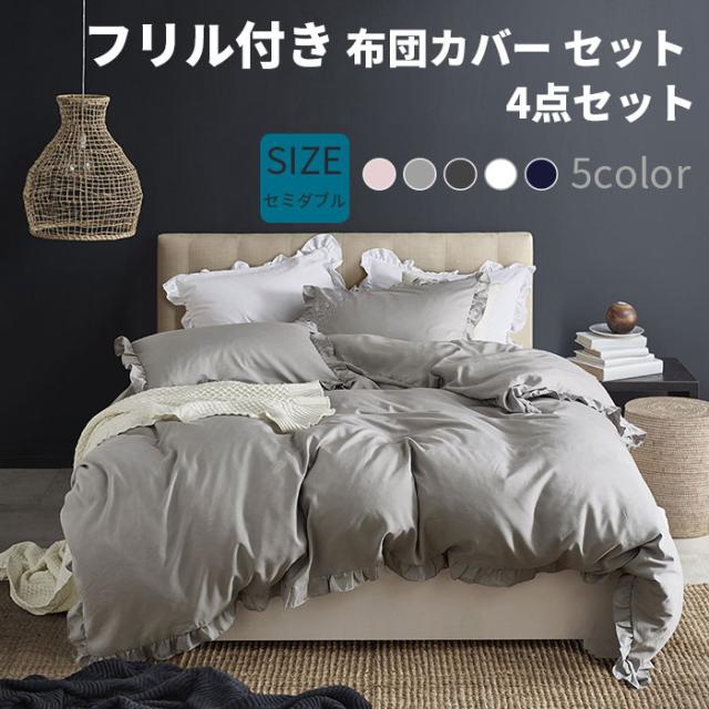 布団カバーセット 4点セット セミダブル 寝具カバー フリル付き ピーチスキン加工 ベッドカバー 掛け布団カバー ボックスシーツ 枕カバー ベッド シーツ カバーセット 可愛い 肌に優しい 洋式・和式兼用 北欧 夏用 丸洗いOK 姫系 寝具 インテリア
