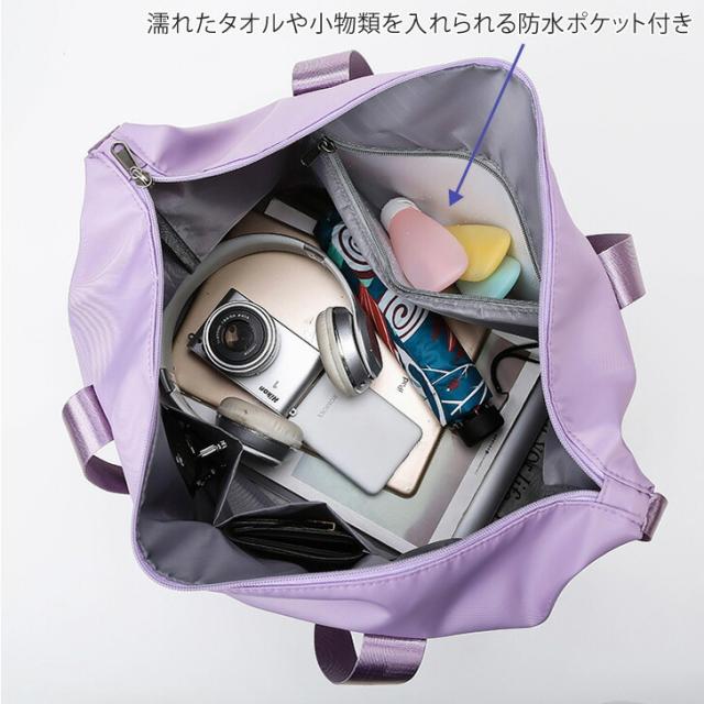 濡れたタオルや小物類を入れられる防水ポケット付き。