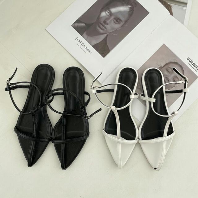 新作 ポインテッドトゥTストラップレザー調フラットサンダル レディース ぺたんこ 歩きやすい 夏 おしゃれ ローヒール 1cmヒール 脱げない 白 黒 韓国 23cm 23.5cm 24cm 24.5cm 25cm