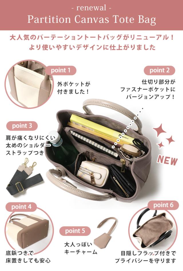新作 カシュカシュ cache cache ショルダー付き パーテーション キャンバス トートバッグ レディース ショルダーバッグ 斜めがけ 小さめ 仕切り 収納 おしゃれ かわいい 大容量 通勤 自立 軽量 多収納