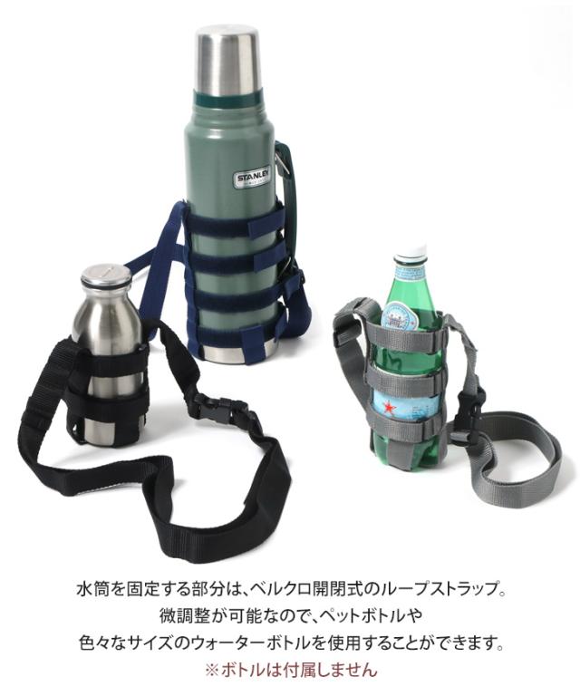 水筒を固定するベルト部分は、ベルクロ開閉式のループストラップで取り外しや微調整が可能