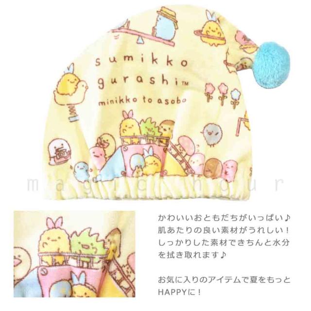 ママにも大人気!すみっコぐらしのかわいくて便利なタオルキャップ♪ かわいいキャラクターと一緒ならもっとプールがたのしくなりそう♪プール帰りやお風呂上がりにも◎ 肌ざわりが良く、厚すぎない吸水性に優れた綿を使用しているので使い心地も◎ 海やプールで大活躍! |