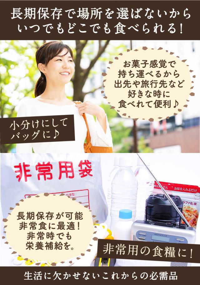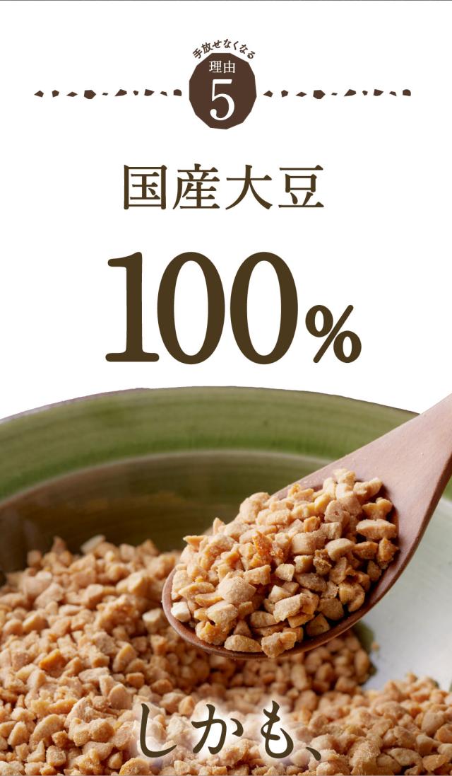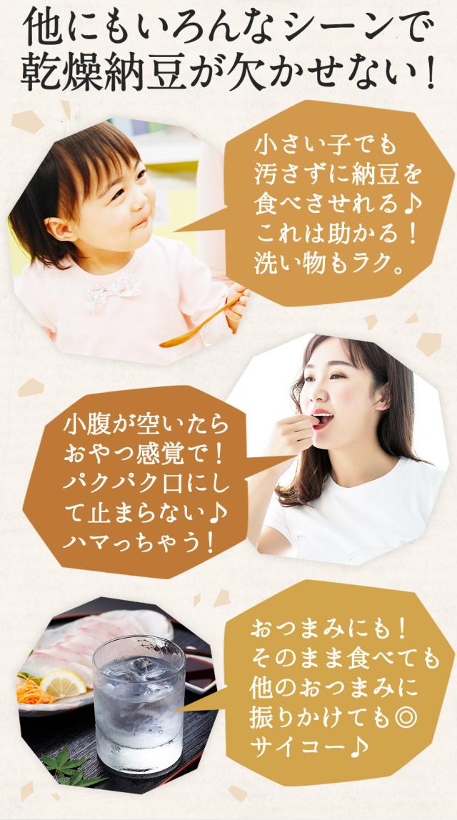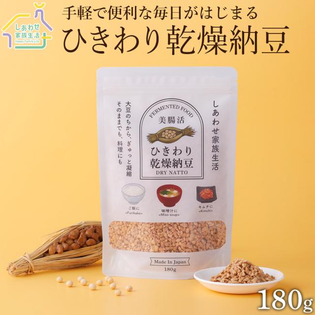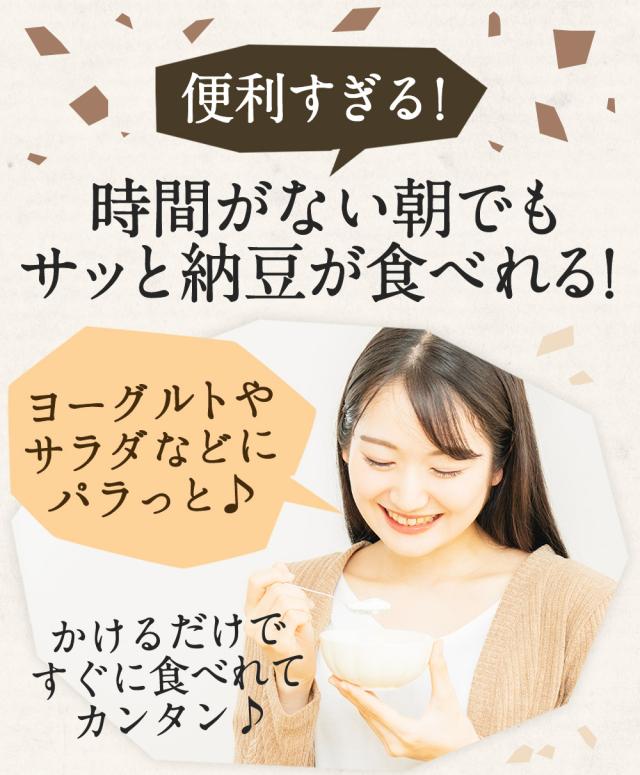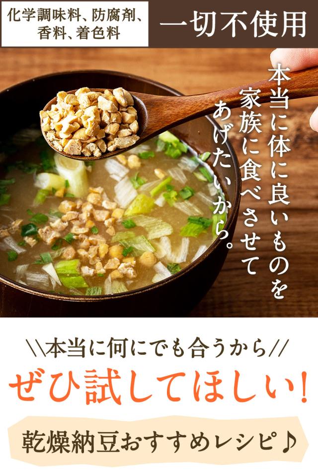 ひきわり大豆の良さが活きる。甘味・旨味のある国産大豆を100%使用しました。パッと簡単いろんなレシピに大豆の旨味と風味を感じさせるひきわり乾燥納豆です。ご飯やおやつ、おつまみにいろいろな場面でお使いいただけます。長期保存が出来て、乾燥しているため汚れることもないのでお子様にもおすすめです。