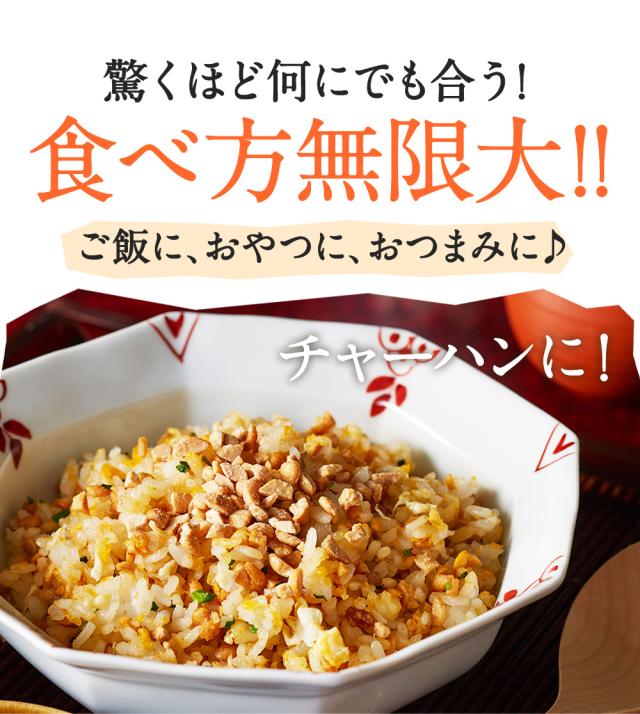 ひきわり大豆の良さが活きる。甘味・旨味のある国産大豆を100%使用しました。パッと簡単いろんなレシピに大豆の旨味と風味を感じさせるひきわり乾燥納豆です。ご飯やおやつ、おつまみにいろいろな場面でお使いいただけます。長期保存が出来て、乾燥しているため汚れることもないのでお子様にもおすすめです。 |