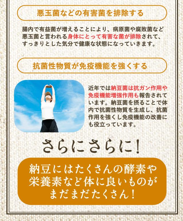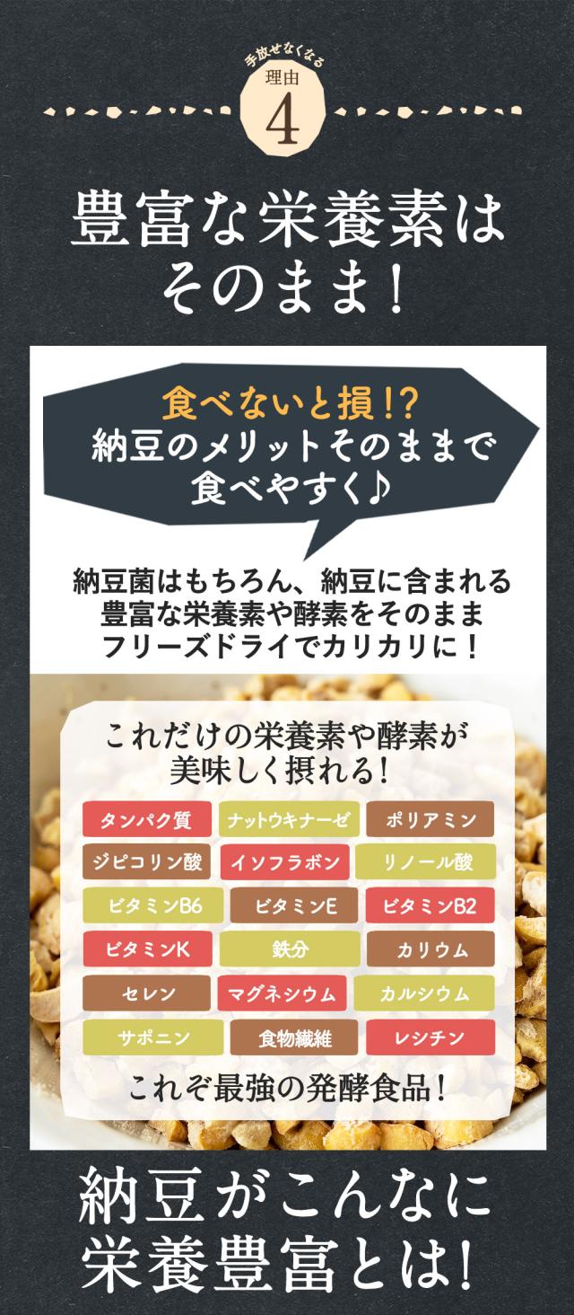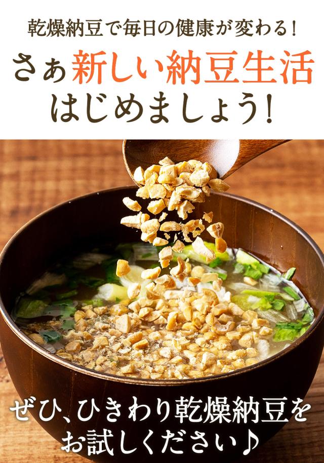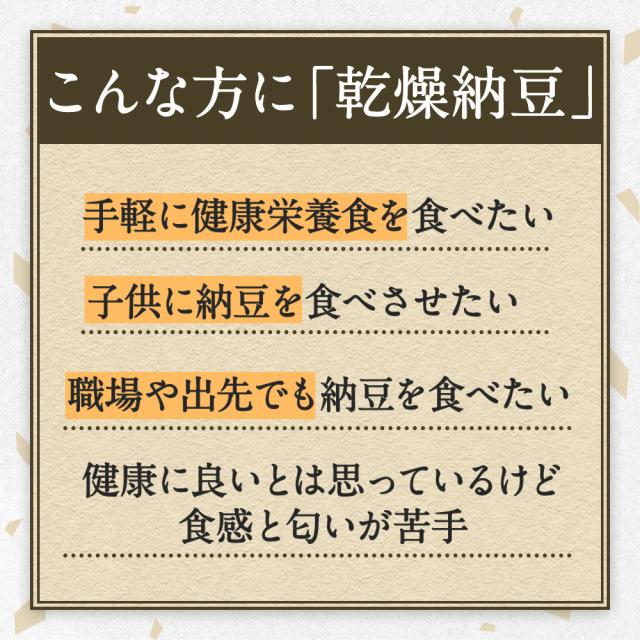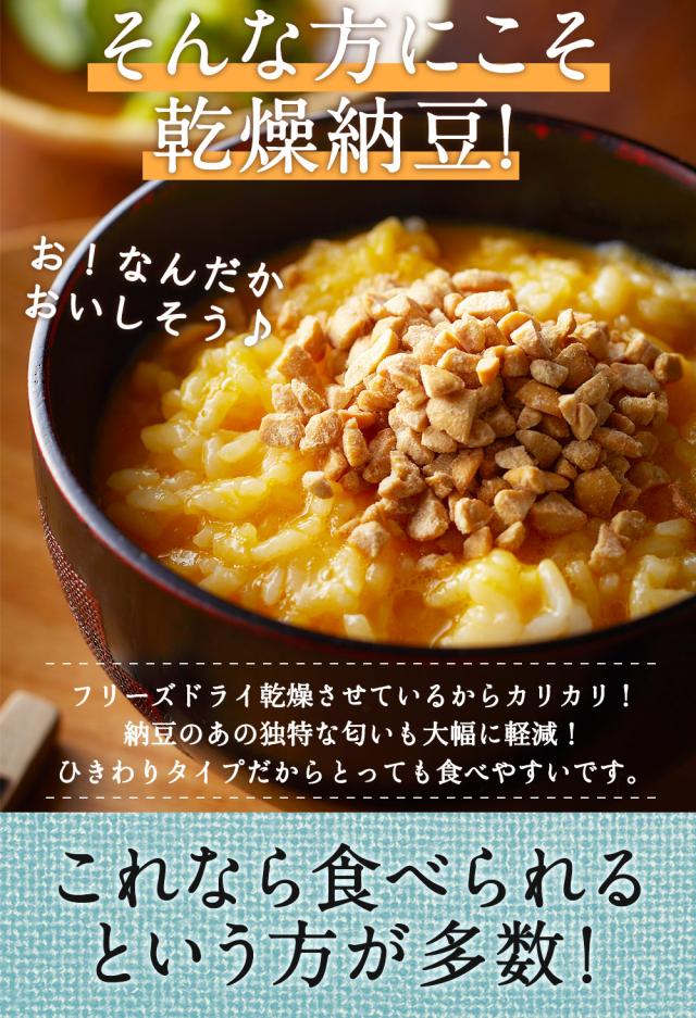 - フリーズドライ納豆の常温保存が気に入って購入しました。3個1パックだと最後の1個の臭いが木になり処分してしまうこともありましたが、乾燥納豆ですと最後まで美味しく食べられそうです。