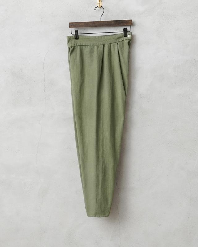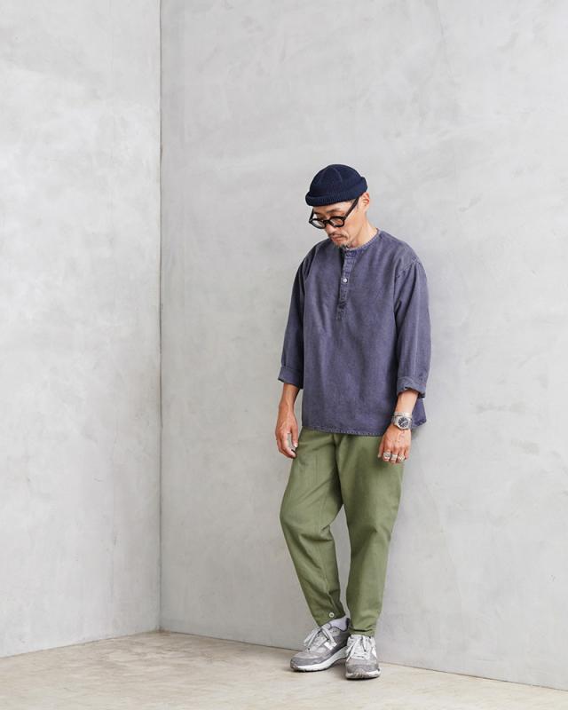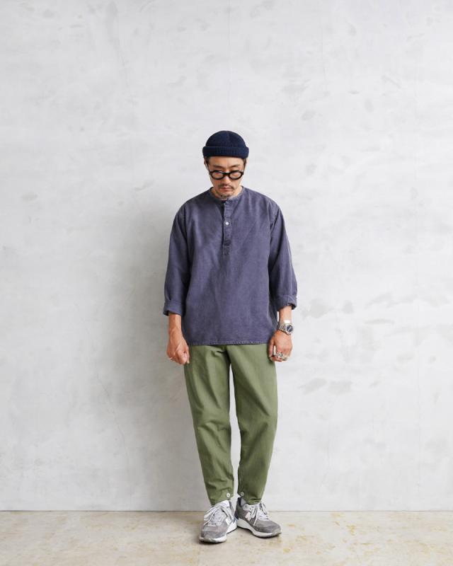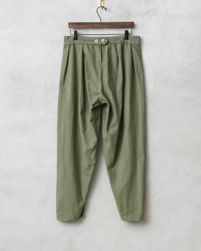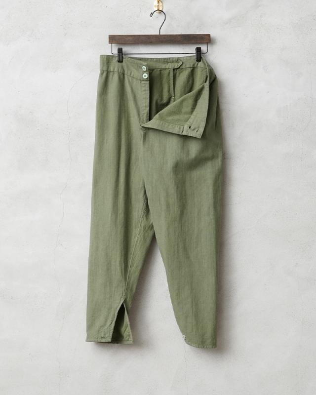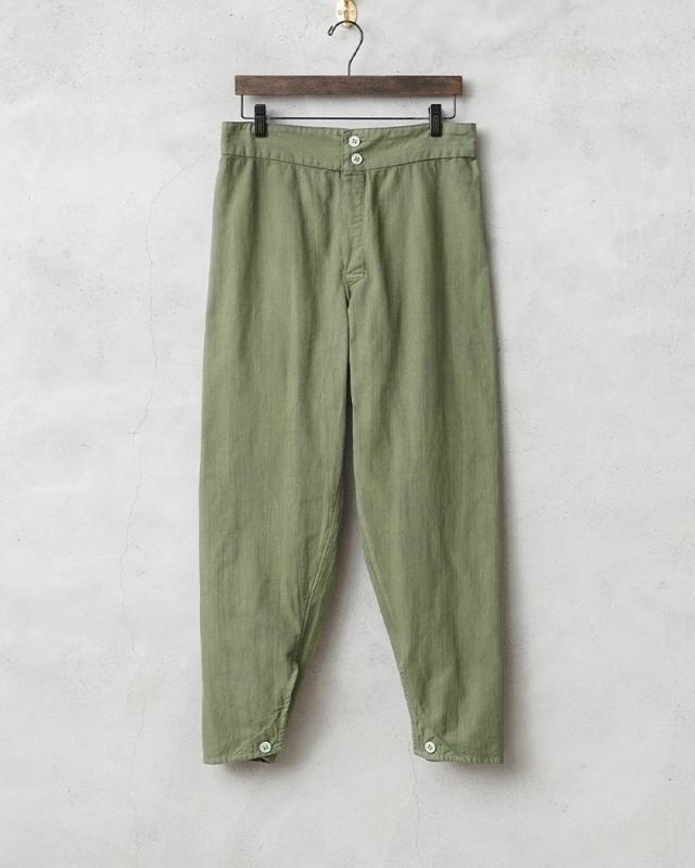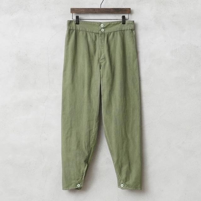 70年代に使用されていたロシア軍(旧ソビエト連邦)のスリーピングパンツです。元々ホワイトだったのですが、染め職人に丁寧にOD染めしていただきました。 ODにする事でかなり良い雰囲気になり、着込むことでさらに風合いの増す1着です。シンプルなアイテムですが裾にかけてテーパードしたキレイなシルエットがポイントです。裾はボタンで開閉し、着脱がしやすくなっています。ウエストは前後共にボタン留めのデザイン。バックボタンでウエストの調節も可能です。後ろにはタック入りでシンプルながら考えられたデザインです。