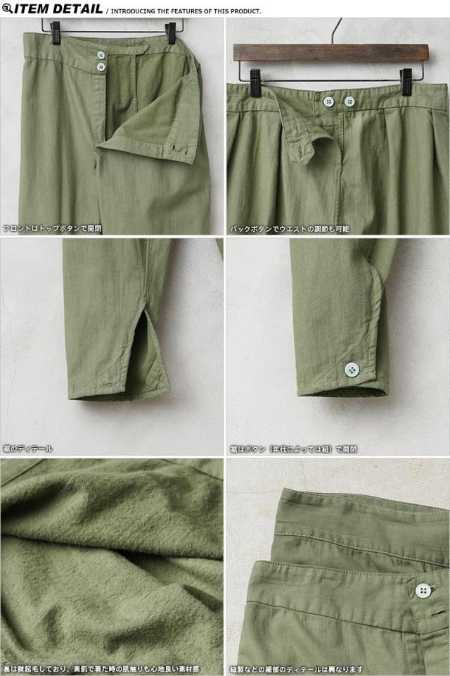 | 商品説明 | 実物 新品 デッドストック ロシア軍 70s スリーピングパンツ ウエストボタン OD染めのご紹介です。 70年代に使用されていたロシア軍(旧ソビエト連邦)のスリーピングパンツです。 元々ホワイトだったのですが、染め職人に丁寧にOD染めしていただきました。 ODにする事でかなり良い雰囲気になり、着込むことでさらに風合いの増す1着です。 シンプルなアイテムですが裾にかけてテーパードしたキレイなシルエットがポイントです。裾はボタンで開閉し、着脱がしやすくなっています。ウエストは前後共にボタン留めのデザイン。バックボタンでウエストの調節も可能です。後ろにはタック入りでシンプルながら考えられたデザインです。 程よく肉厚でハリのあるコットン100%生地は雰囲気抜群で、ネップ感のある年代の古いコットンの風合いも抜群です。 裏は微起毛しており、素肌で穿いた時の肌触りも心地良い1枚です。 1点1点微妙に異なった表情も魅力で、スリーピングパンツはスニーカー、ローファー、サンダルなどとも相性抜群で、程よく着くずすしリラックスしたスタイルに最適で気軽に穿いていただけるアイテムです。 | ||||||||||||||||||||||||||||||||||||