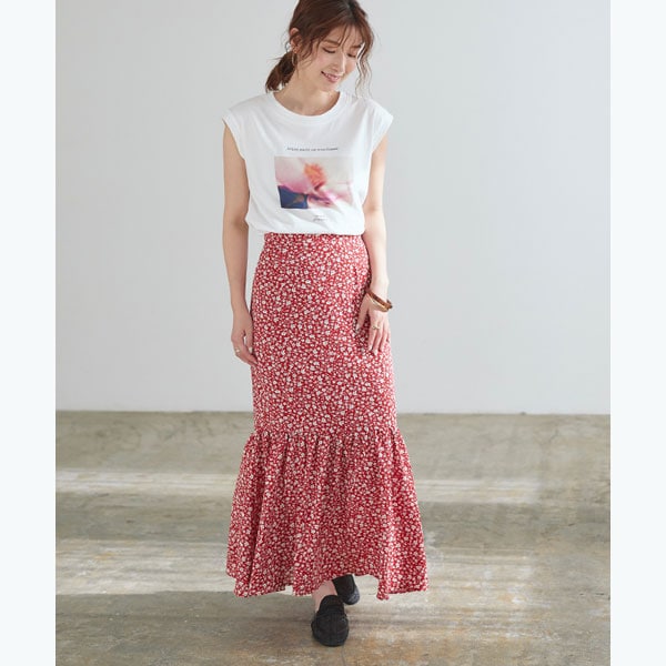 程よいゆるさのシルエットで大人女子にぴったりの花柄マーメイドロングスカート。