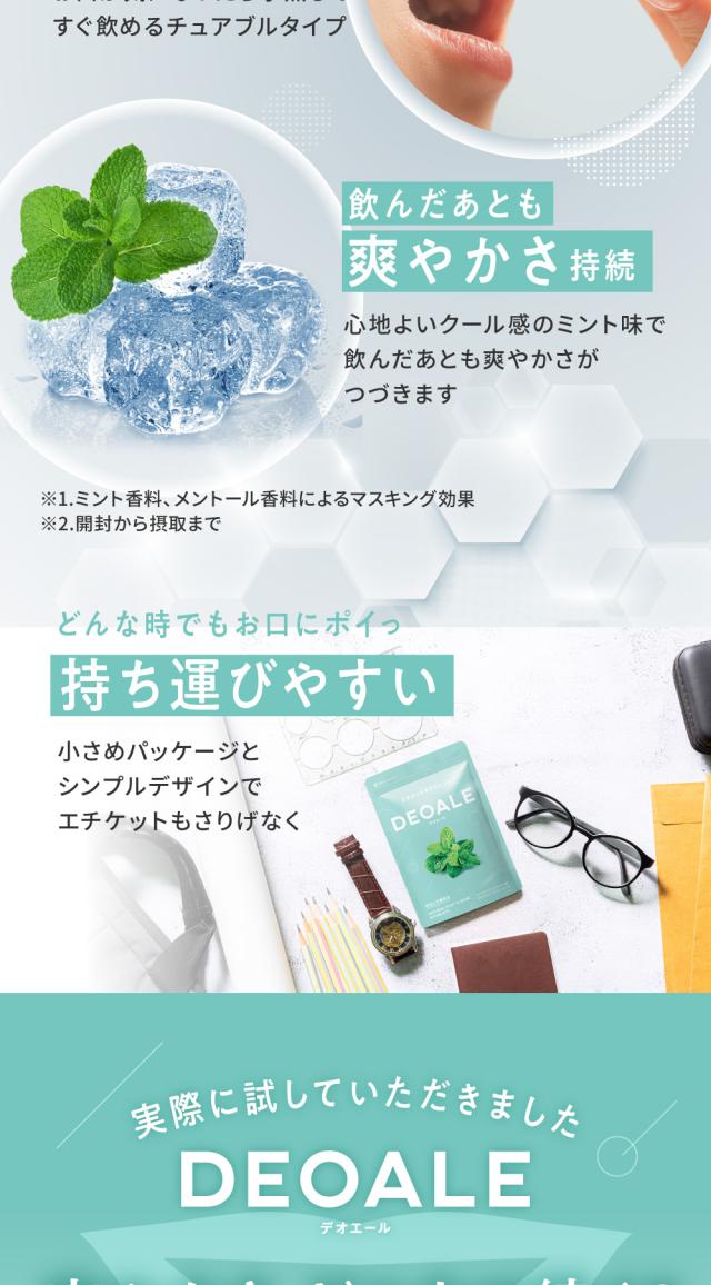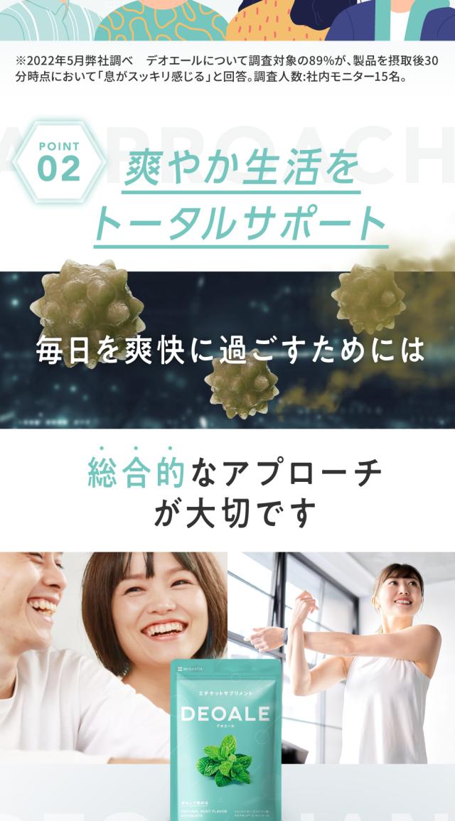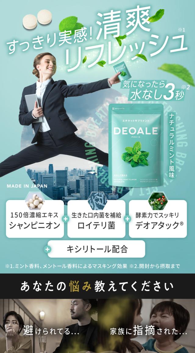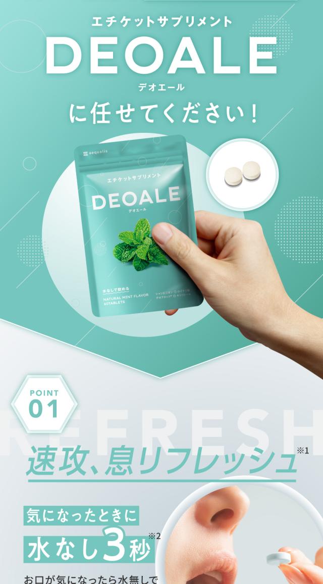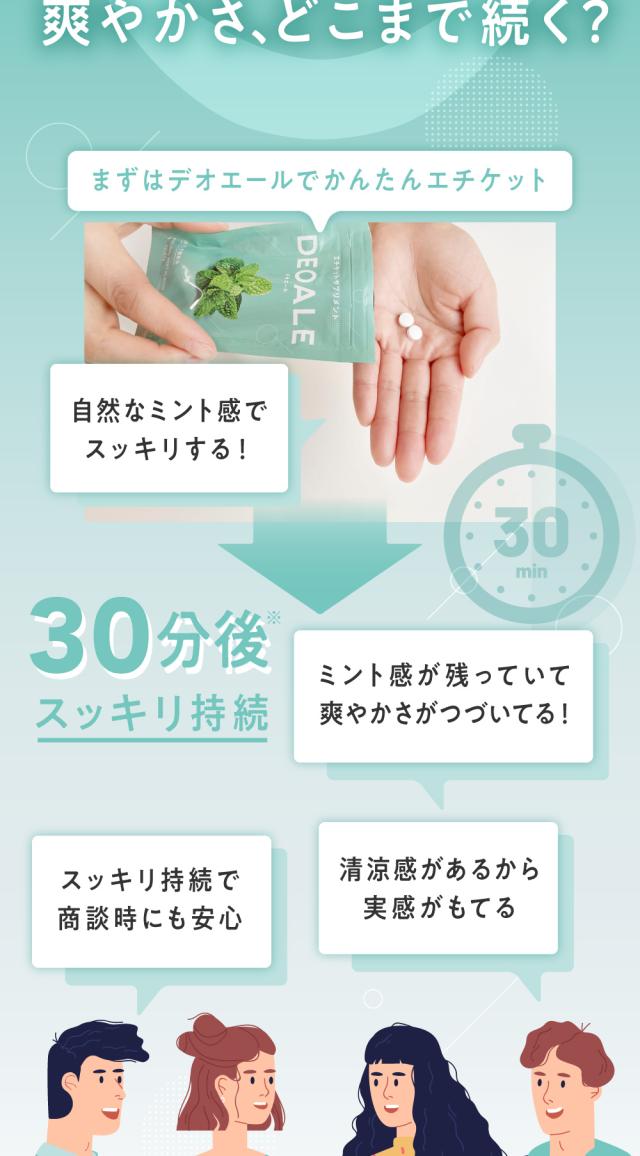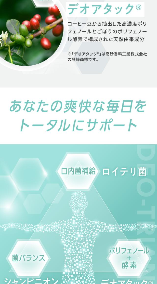 ・その場限りのミントタブレットとは違う!デオエール独自のデオトライアングル処方があなたをトータルサポート。ロイテリ菌・シャンピニオン・デオアタックでしっかりアシスト。