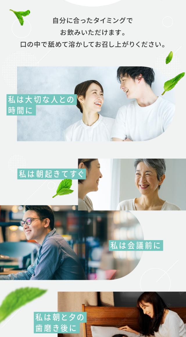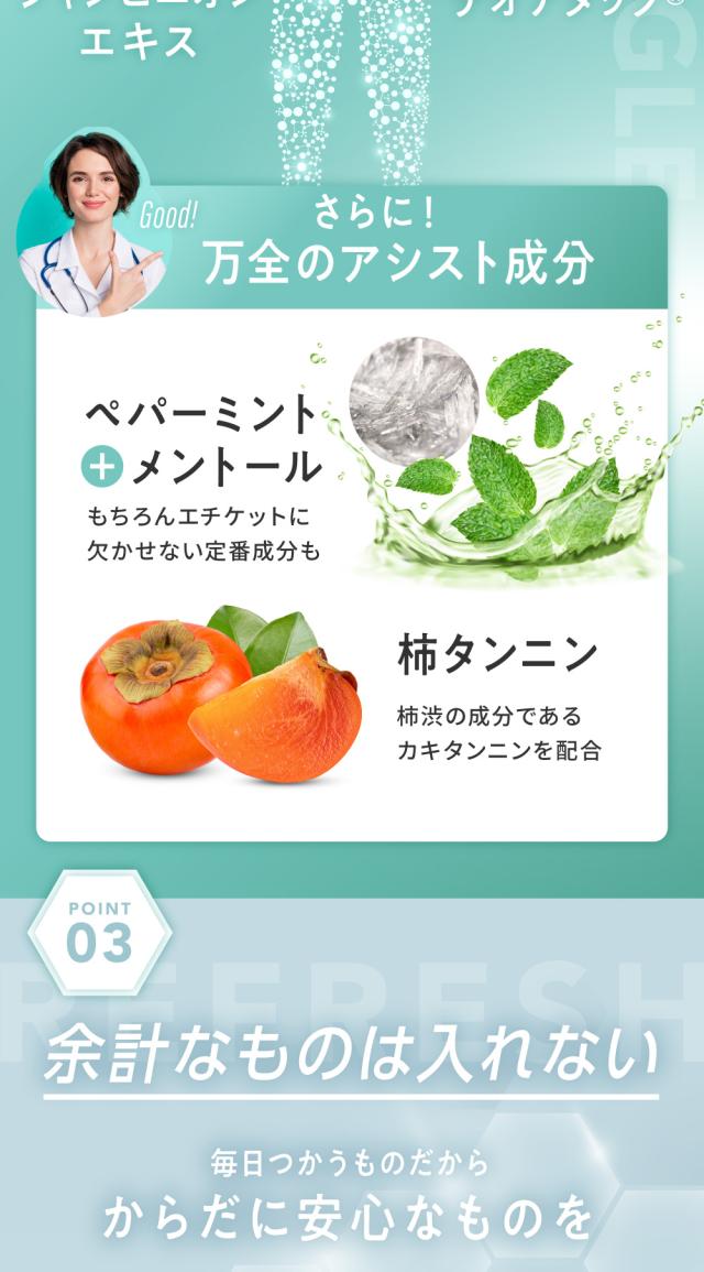 ・口臭を3秒リフレッシュ(ミント・メントール香料によるマスキング効果)持ち歩けるオシャレなパッケージで気になったらすぐにその場でお飲みいただけます。