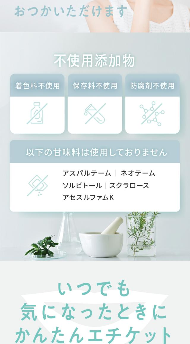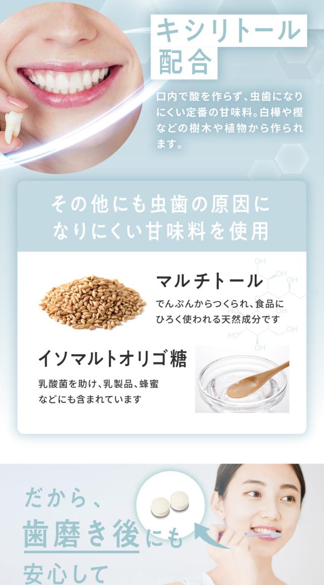 ・歯の健康を保ち虫歯になりにくいキシリトールを配合。さらに虫歯の原因にはならない特別な天然甘味料を使用することで、歯磨き後も安心してお使いいただけます。もちろん人工甘味料は不使用。
