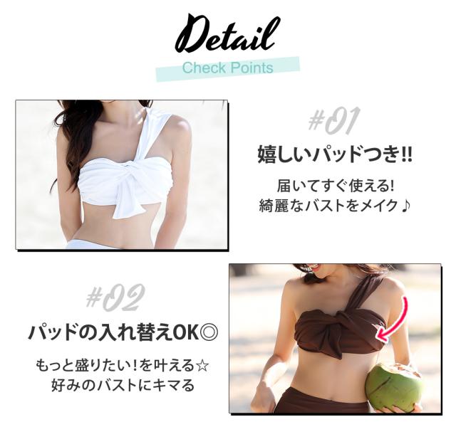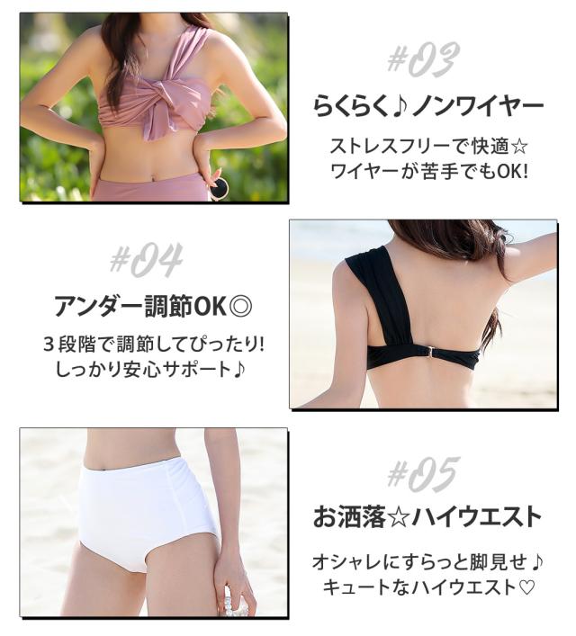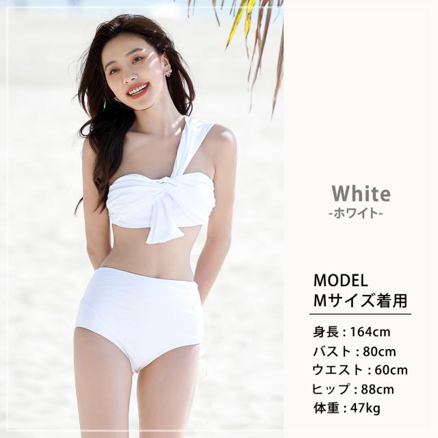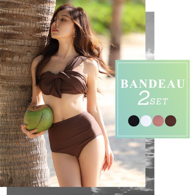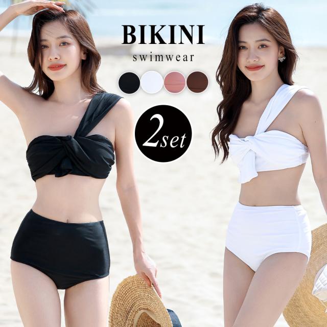 春新作 即納 水着 レディース バンドゥビキニ 2点セット おしゃれ かわいい ワンカラー 黒 白 無地 ブラ シンプル ショーツ ベーシック セクシー ワンショルダー 流行 ノンワイヤー パッド付き アンダー調整 ハイウエスト 脚長効果 海 ビーチ プール リゾート