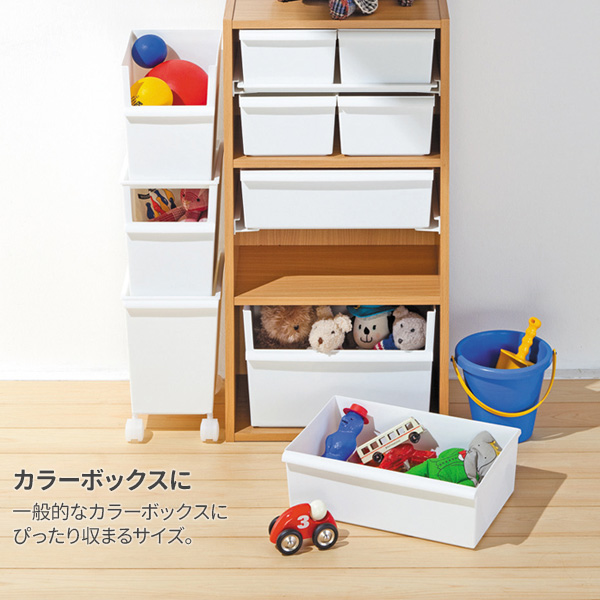 カラーボックスの1段分にぴったりサイズの浅型 収納コンテナー。