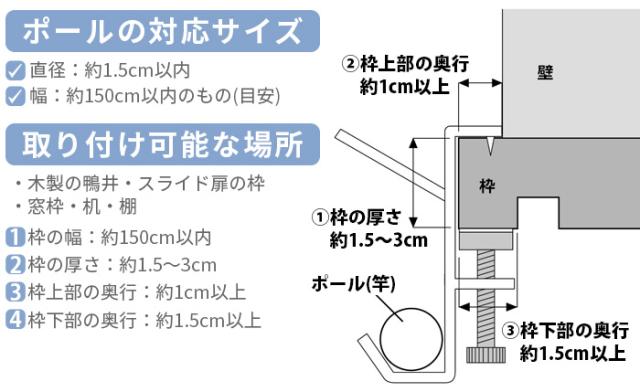 | 木製の鴨居、スライド扉の枠、窓枠、机、棚 枠の幅:幅約150cm以内 枠の厚さ:約1.5〜3cm 枠上部の奥行:約1cm以上 枠下部の奥行:約1.5cm以上 |